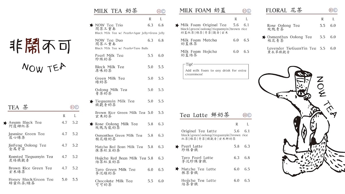 The menu at Now Tea Commerce Gate offers a variety of bubble tea beverages centered around traditional and contemporary tea flavors with customizable toppings. It is structured into several distinct categories to help customers select drinks based on their preferences.